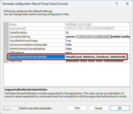 - Click on the Supported Authentication Modes row, “V” will appear at the end