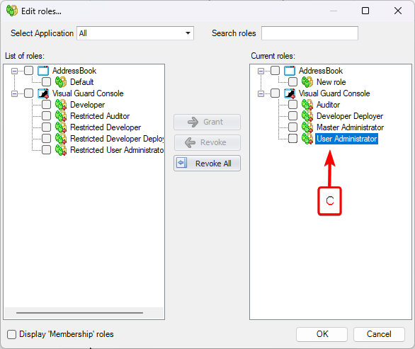 Setp 4: Click on “-> Grant” , the granted role will be displayed in Current role section(C).